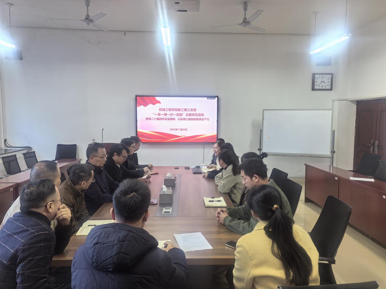 为深入学习宣传贯彻党的二十届四中全会精神,11月25日下午,机械工程学院教工第三党支部在学院311会议室组织开展“一月一课一片一实践”主题党日活动。活动由支部书记白泉主持,学院党委书记邹鸿翔、支部全体党员参加。