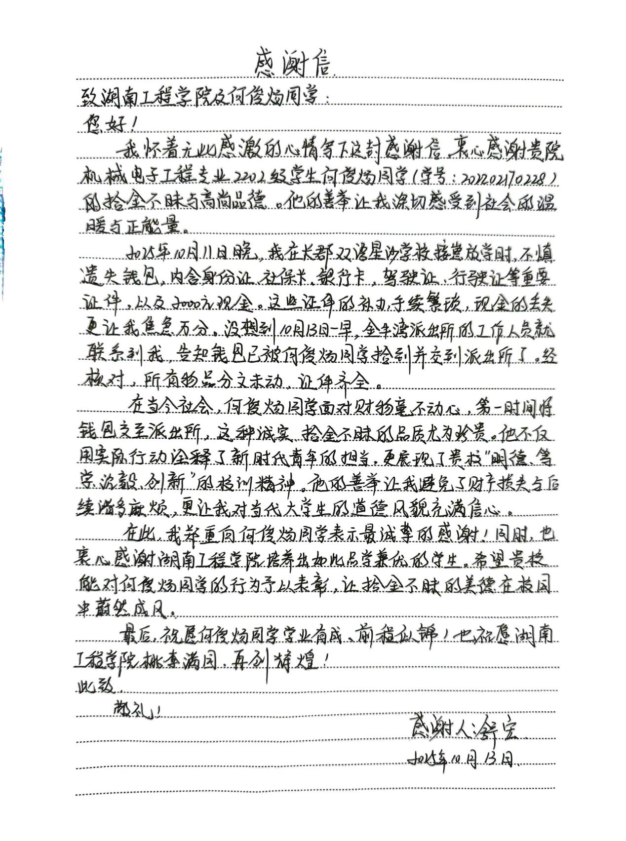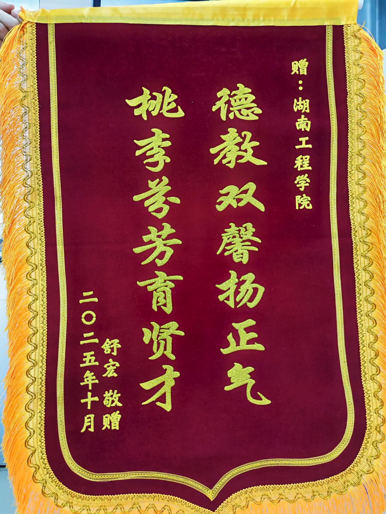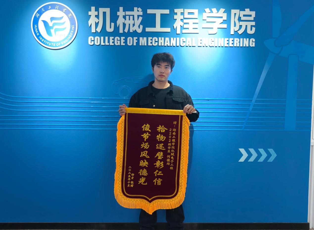 近日,机械工程学院学生工作办公室收到两面锦旗与一封感谢信,致谢机械电子工程2202班何俊炀同学的拾金不昧之举,也为学校立德树人的扎实成果“点赞”。